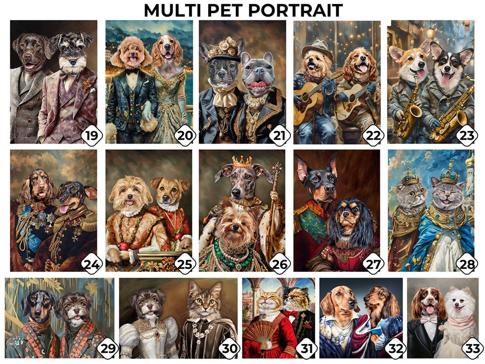 Perfect for pet couples, siblings, or best friends. Whether you have two dogs, two cats, or one of each, our artists will blend their photos seamlessly into these classic Renaissance and vintage costumes.